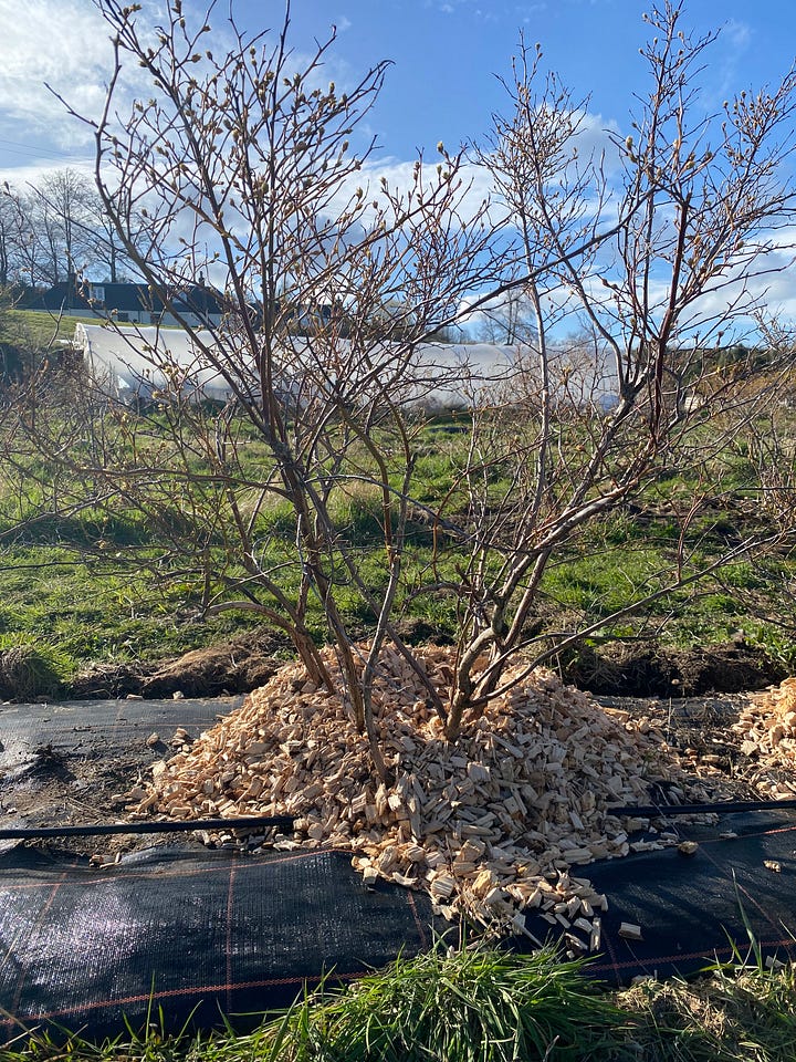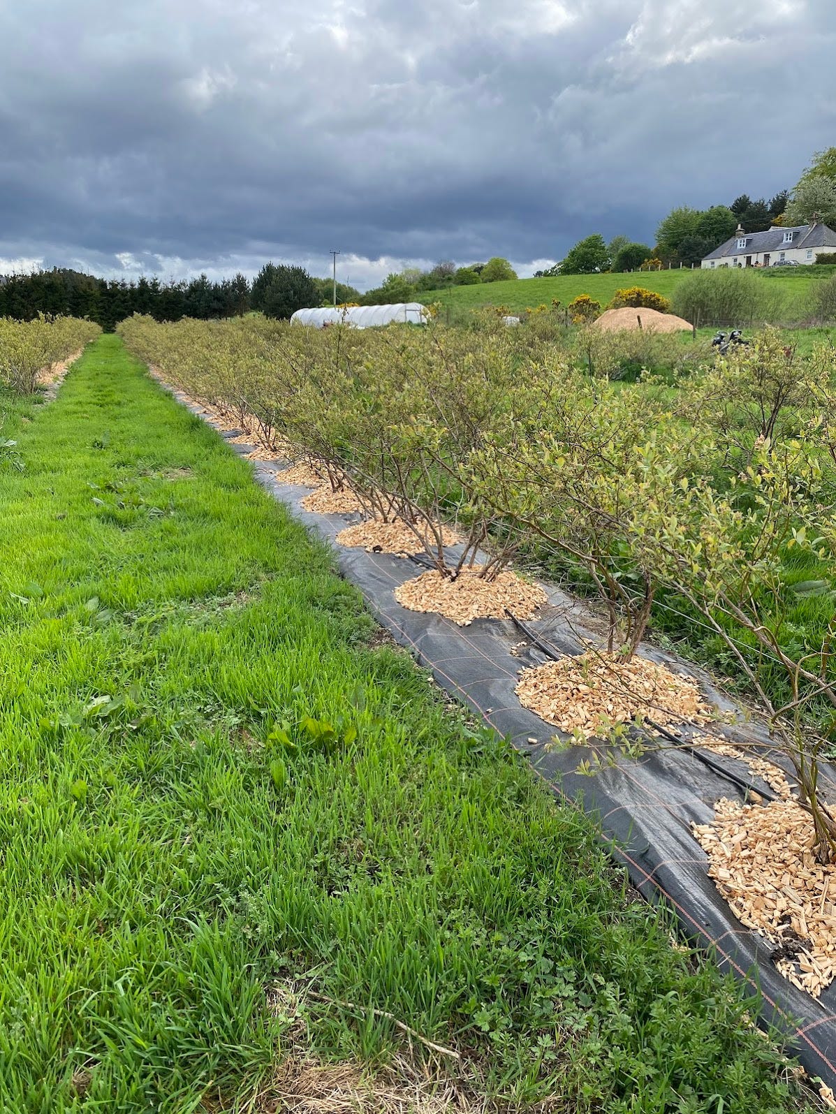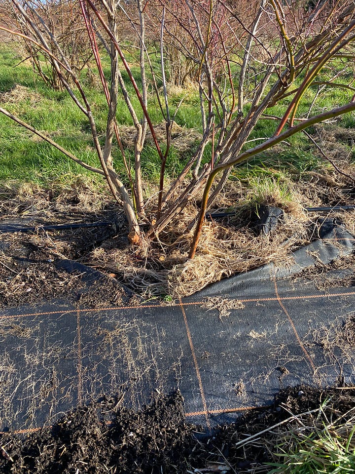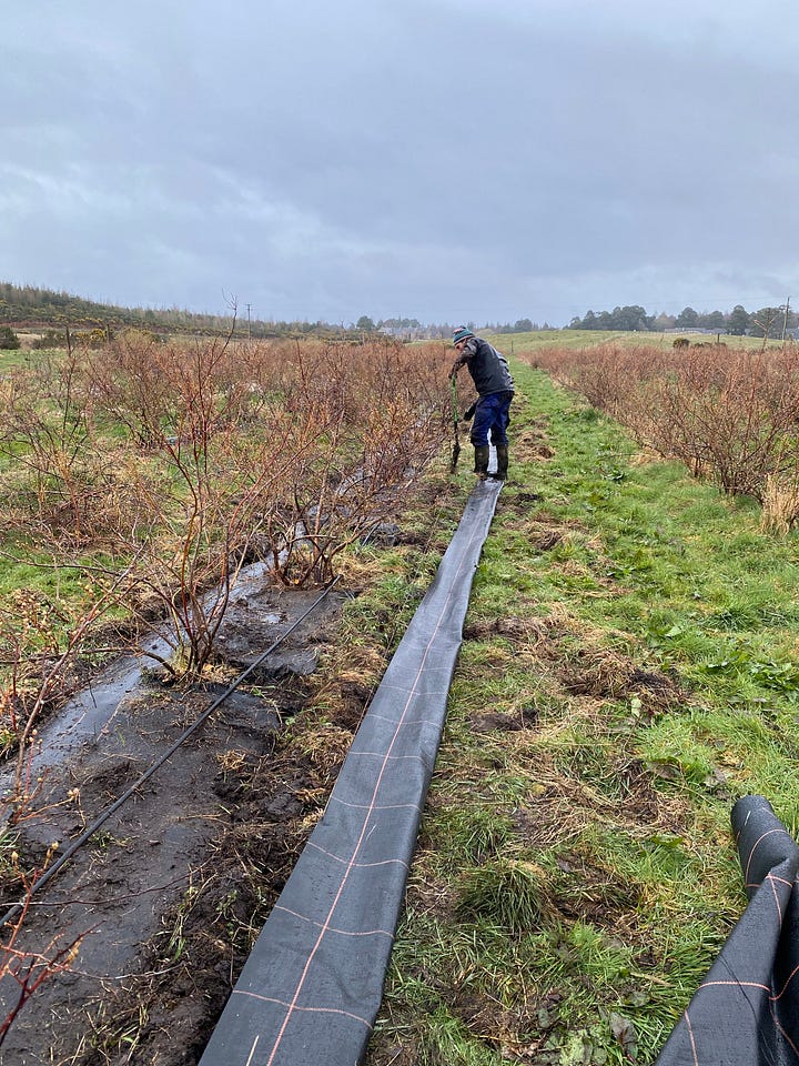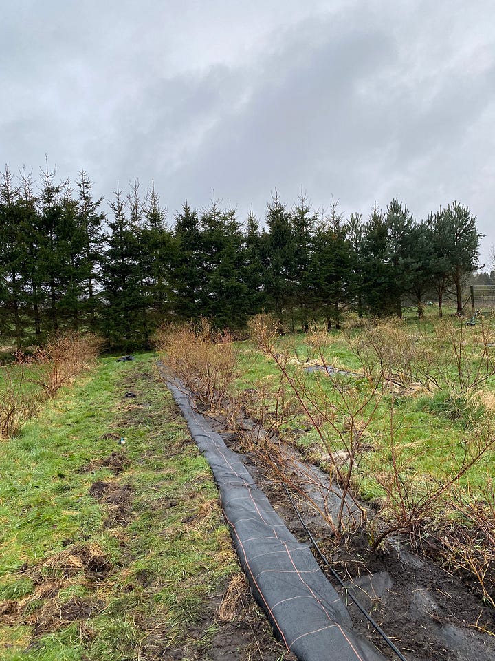 When the blueberry bushes were first planted, they were done so in a plastic weed membrane, i.e., a layer of weed preventative plastic material. Imagine a rectangle about 1m in width and c.100m long. Inside this rectangle, every 1m, a hole was cut out of the plastic and a blueberry bush planted within. If you don’t protect weed membrane from the elements then the elements will just grow over the top of it. Over the last 15 years, the weed membrane has completely disappeared under grass.