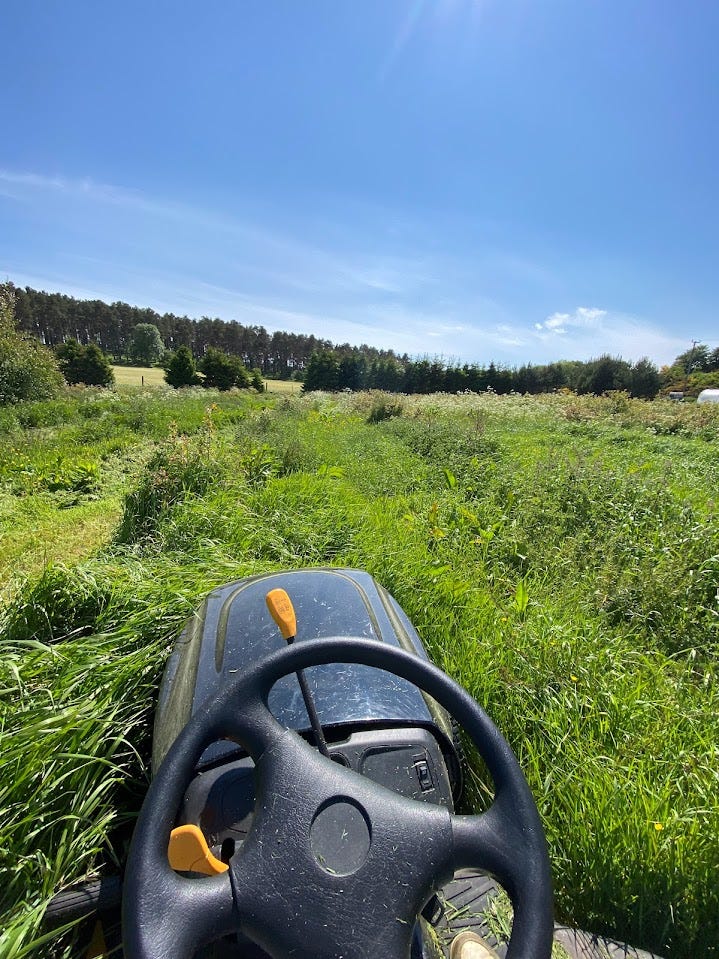 Step 1 was absolutely critical: remind yourself why you have decided to use your holiday allowance to dig up ancient plastic weed membrane. The photo above was taken by me last summer. I’m sitting on the mower, trying to locate my rows of blueberry bushes. I might have been mowing row 23, row 22, or maybe I’m not mowing any of the blueberry rows and I’m actually in a different area entirely.